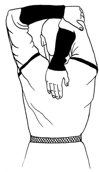 Встаньте на пол, выпрямите спину, пятки соедините, носки разведите в стороны. Сделайте глубокий вдох. Поднимите руки над головой, согните их в локтях и, скрещивая, заведите за голову. Помощник, стоящий сзади, должен обхватить ладонями ваши запястья или предплечья, плавно тянуть ваши руки немного в стороны и вниз. Во время потягиваний делайте глубокий вдох.