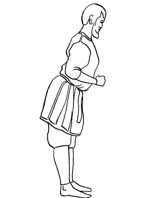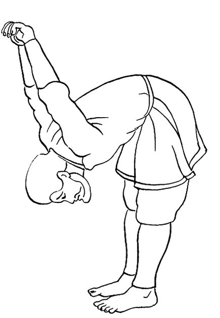 Встаньте на пол, выпрямите спину, пятки соедините, носки разведите в стороны. Сделайте глубокий вдох. Отведите руки назад и соедините ладони за спиной в замок. Выдыхая, наклоняйте корпус вперед, поднимая руки. Старайтесь наклониться как можно ниже. При этом расслабьте мышцы рук и плечевого пояса, двигая руки как можно дальше вперед. Плавно вернитесь в исходное положение.