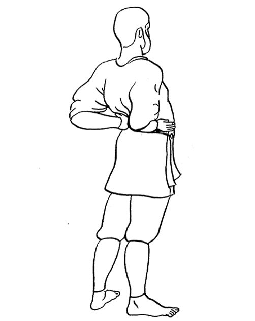 Сделайте глубокий вдох. Согните руки в локтях и заведите их за спину. Запястьями обопритесь о поясницу. Выдыхая, сводите локти за спиной, пытаясь соединить их.