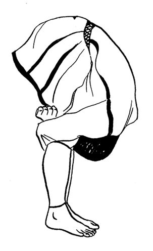 Встаньте на пол, выпрямите спину, стопы соедините. Сделайте глубокий вдох. Наклоните голову вперед, прижимая подбородок к груди. Плавно наклоняйтесь вперед, стараясь касаться подбородком грудной клетки, живота, ног. Прижмите лоб к коленям и обхватите ноги руками. Задержитесь в таком положении на несколько секунд.