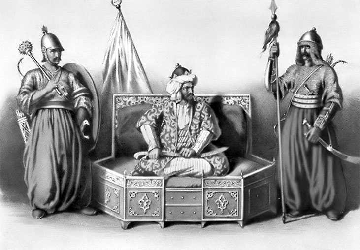 Разнузданные в убийствах и грабежах, османцы в то же время непоколебимо придерживались предписаний, вынесенных еще их предками, может, из далекого Турана, записанных огузскими ханами: «Отец огуз-ханов провозгласил и определил тюре – пути и наставления его сыновьям. Он сказал: учитывая то, что ханом с течением времени станет Кайи, да будет провозглашен он бейлербеем [14] правого крыла. Но в соответствии с тюре бейлербей должен быть также и у левого крыла. Да будет им Байиндыр. Тюре угощения тоже должно иметь такой порядок, о брат мой: сначала должен садиться Кайи, затем Байяи, затем Алкаевли и Караевли, после них пусть садится Язир, а за ним Дюкер, а уже потом, разумеется, Тудирга, Япурлу, Явшар, Кызык, Бедели, и самым последним на правом крыле – Каргин.