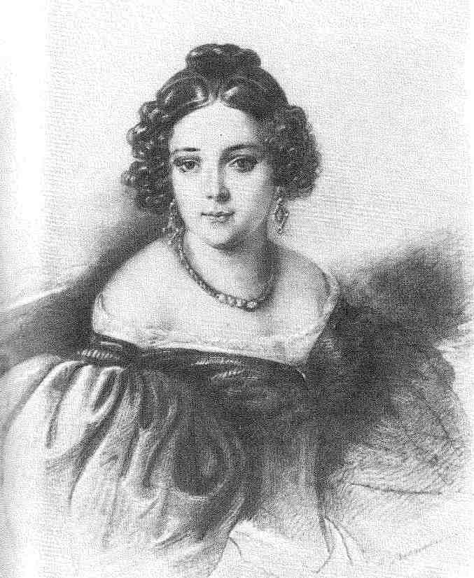 Нежный, чистый овал. Удлиненные томные глаза. Пухлые губы, в уголках которых словно спрятана любезная улыбка. Высокая прическа, тонкая шея, покатые плечи… А выражение лица такое, как сказано в одном из лермонтовских стихотворений, ей посвященных: