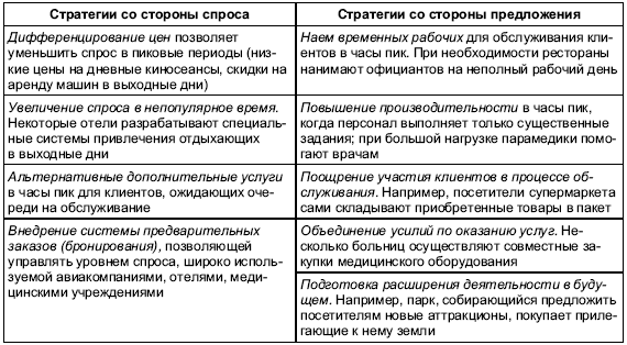 Услуги несохраняемы. Как только самолет оторвался от взлетной полосы, а фильм в кинотеатре начался, непроданные билеты нельзя придержать до следующего раза. Невозможность хранения услуг не имеет значения в условиях устойчивого спроса, сложности возникают при существенных колебаниях рыночных потребностей в предлагаемом сервисе. Например, предприятиям общественного транспорта приходится содержать «лишние» транспортные единицы, которые используются преимущественно в часы пик. Поставщики услуг могут бороться с несохраняемостью разными способами. В табл. 11.1 приведен ряд стратегий, предложенных У. Сассером для определения оптимального соотношения между спросом и предложением в сфере услуг. [371]Таблица 11.1. Определение оптимального соотношения между спросом и предложением.