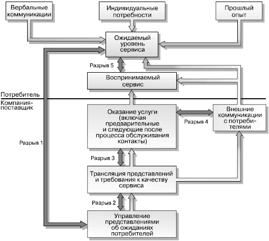 4 . Разрыв между фактическим предоставлением услуги и внешними коммуникациями. Ожидания потребителей во многом зависят от заявлений представителей компании, ее рекламы. Если в рекламном буклете больницы изображены комфортабельные палаты, а пациент попадает в плохо отремонтированное помещение, то внешние коммуникации организации обманули его ожидания.
