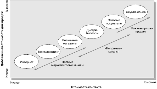 Каждый вариант канала распределения необходимо оценить по экономическому критерию, степени контроля и адаптации. С экономической точки зрения, каждый вариант организации маркетингового канала характеризуется разным уровнем продаж и затрат. На рис. 13.4 показано, каким образом можно ранжировать шесть различных каналов по критерию добавленной стоимости и затрат на заключение сделки. Сначала следует определить, кто из участников канала обеспечит больший объем продаж – торговый персонал фирмы или специализированное торговое агентство. Следующий шаг – расчет затрат на продажу различных объемов товара через разные маркетинговые каналы. Компании, которым удается успешно переключить своих клиентов на канал с меньшими издержками (разумеется, без потери объема продаж и качества обслуживания), получают преимущество канала распределения . [445]Рис. 13.4. Соотношение «добавленная стоимость–затраты» для каналов Источник: Oxford Associates, Dr. Rowland T. Moriarty, Cubex Corp.