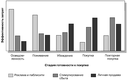 Рис. 15.4. Экономическая эффективность трех инструментов коммуникации на различных стадиях готовности покупателя к покупке.