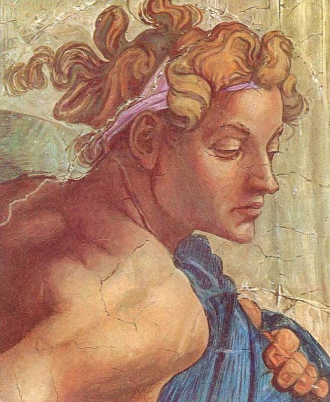 Микеланджело. «Голова юноши». Фрагмент, 1508–1512 годы, плафон Сикстинской капеллы, Ватикан