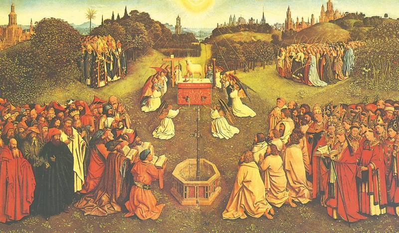Я. ван Эйк. «Поклонение агнцу». Гентский алтарь, 1432, церковь Святого Бавона, Гент