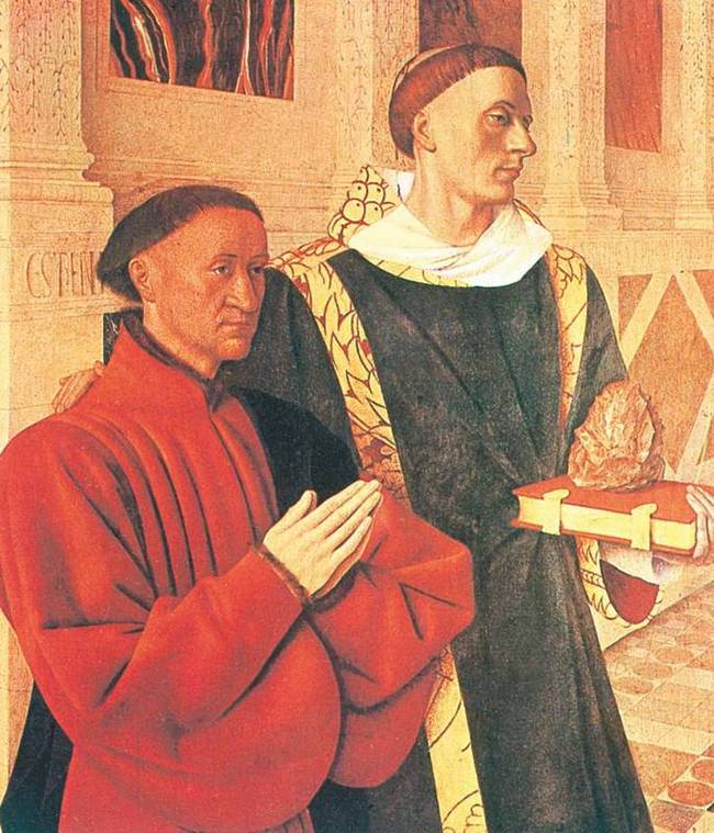 Ж. Фуке. «Этьен Шевалье со святым Стефаном». Левая створка «Меленского диптиха», около 1450 года, Королевский музей изящных искусств, Антверпен