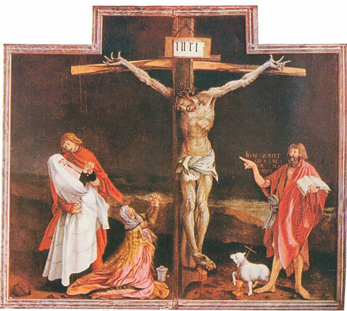 Самая известная работа Грюневальда — многостворчатый алтарь церкви Святого Антония в городе Изенгейме. По сложности и глубине замысла это произведение не имеет равных в немецкой живописи. Алтарь состоит из трех циклов, появляющихся перед зрителем друг за другом в зависимости от положения створок его центральной части. Если створки закрыты, зритель видит перед собой сцену «Распятия», по бокам которой представлены фигуры святых Себастьяна и Антония. Жуткое впечатление производит образ мертвого Христа, его израненное худое тело, искаженное мукой лицо, застывшая кровь на кистях рук и ступнях ног. Художник как будто стремится напомнить людям о той безмерной цене, которая была заплачена за грехи человечества. Возможно, Грюневальд вложил в произведение и более глубокий смысл, пытаясь таким образом выразить свой протест по отношению к кровавым событиям эпохи, к злу и несправедливости, царящим в мире. Страдания отдельного человека у Грюневальда достигают вселенских масштабов, превращаясь в символ общенародной скорби.