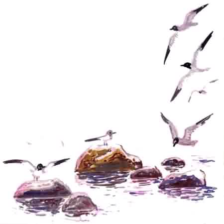 Внимание Тупса привлекли птицы, задумчиво и неподвижно сидевшие на прибрежных серых валунах. Собачонка, воинственно тявкая, помчалась к ним, и птицы нехотя взлетели. Они медленно кружили над берегом, паря в воздушных волнах, и пламя заката окрашивало их крылья и грудки в розовый цвет.