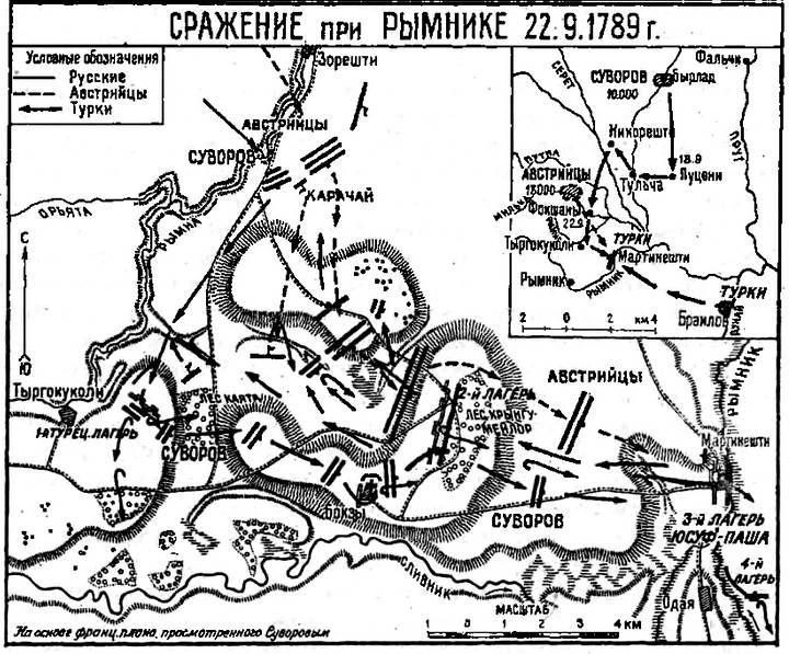 Места для переправы через реку Рымну были найдены у деревни Черешти и севернее Тырго-Кукули у села Богач. На основе полученных данных Суворов разработал диспозицию. По плану Суворова войска союзников должны были разделиться на две колонны, переправиться через Рымну а затем начать наступление. Дивизия Суворова должна была нанести удар по лагерю у Тырго-Кукули, а корпус австрийцев — по главному лагерю у Крынгу-Мейлора. Дивизия Суворова должна была присоединиться к австрийцам после поражения турок у Тырго-Кукули и дальше уже действовать сообща. Суворов писал: «Начинать малым лагерем, потом на большой... Построясь орденом баталии, вмиг перешед Рымну идти храбро, атаковать при Тырго-Кукули, или всех встречающихся варваров лагери. Один за другим... Поспешность, терпение, строй, храбрость, сильная дальняя погоня».