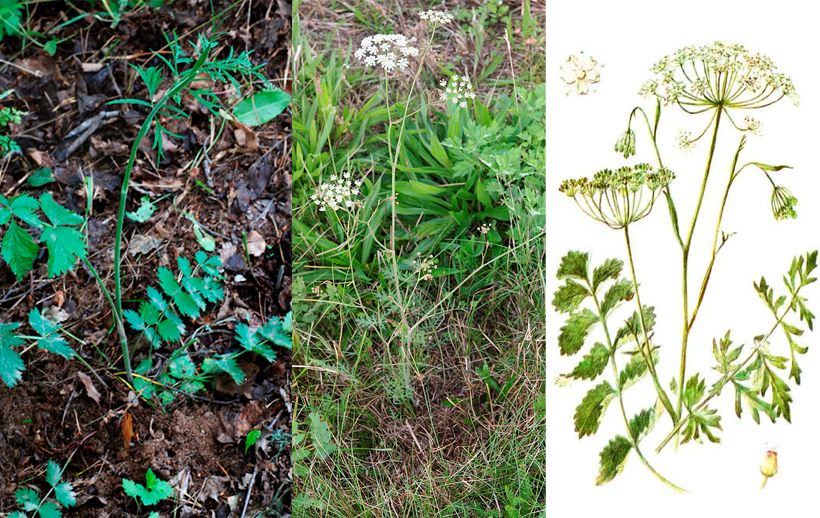 Стебель высотой 15–80 см, прямостоячий, округлый, тонко ребристый, плотный, при основании с розеткой прикорневых листьев, ветвистый, олиственный только в нижней части, вверху почти безлистный, вместе с листьями коротко опушённый или почти голый. Корень веретеновидный, ветвистый. Нижние листья с черешками длиной 10–20 см, с яйцевидными или округло-яйцевидными, тупыми, крупно зубчатыми листочками, в числе трёх — пяти пар; конечный листочек часто трёхлопастной или трёхраздельный. Средние — с более глубоко рассечёнными на узкие доли листочками, при основании клиновидные, сидячие на влагалищах. Верхние — перистые. Зонтики с тонкими голыми лучами, щитковидные, обёртка отсутствуют. Семена голые, коротко яйцевидные, длиной 2–2,5 мм, шириной 1–1,5 мм.