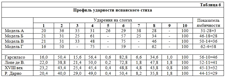 Из испанских поэтов было обследовано 4 выборки по 500 стихов: (1) Гарсиласо де ла Вега, 30 сонетов и начало эклоги III; (2) Лопе де Вега, поэма «Драконтея», II; (3) поэты конца XVIII в.: «Послание к Фабию» Ховельяноса, «Меланхолик» Мелендес Вальдеса, «Осень» Сьенфуэгоса; (4) Р. Дарио, стихи разных лет. Результаты обследования вынесены в табл. 6; здесь же — и теоретически рассчитанные 4 модели испанского стиха.
