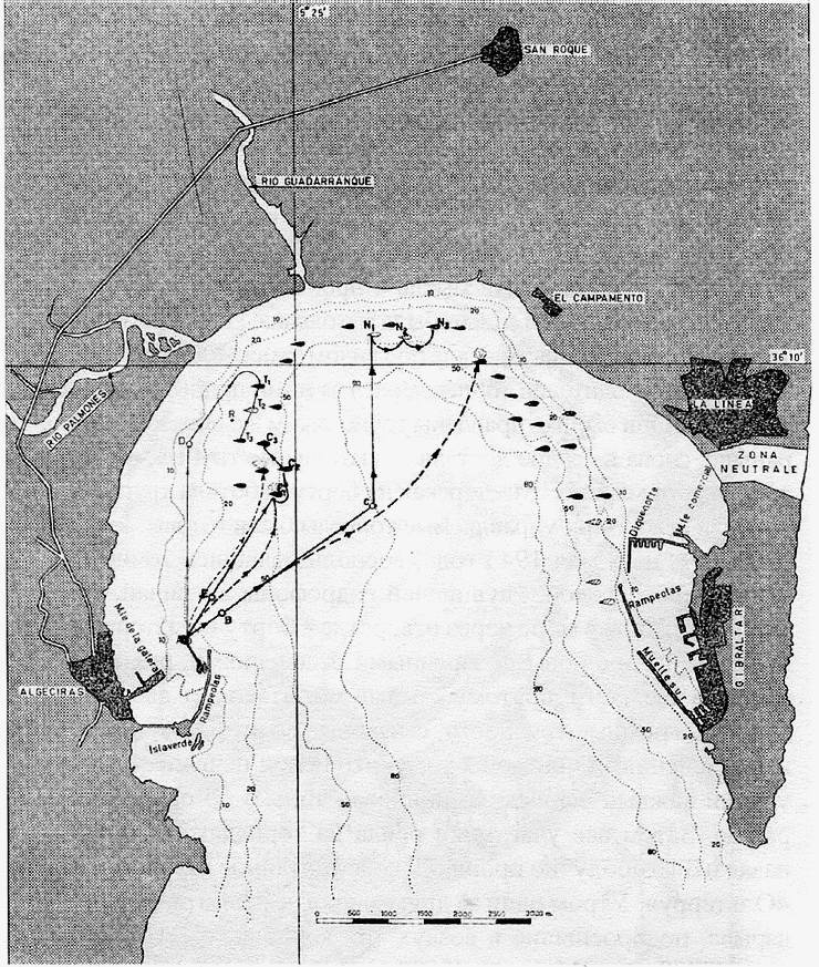 Вечером 30 июня, когда любопытство, вызванное прибытием нового лица, утихло, друзья задержались на пляже. Когда они остались одни, пловец прошел в купальную кабину и принялся рыться в сумке со спортинвентарем. Через несколько минут он в полном снаряжении с двумя зарядами на поясе скользнул в воду и тотчас же, без единого звука, исчез во мраке ночи. Проплыв 2300 метров, он оказался вблизи греческого судна «Орион» (7000 т), груженого хромом. Держась в тени барж, пловец подплыл к самому борту, включил кислородный прибор и погрузился. Прикрепить заряды к килю, вынуть предохранители и возвратиться на поверхность — потребовало лишь нескольких минут. В 4 часа утра Ферраро был уже в своей постели.