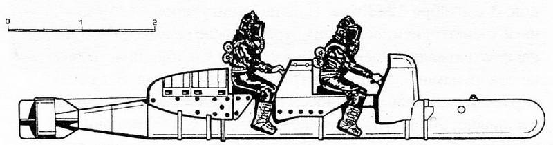 И вот в конце декабря 1942 года на Мальте ограниченному кругу лиц были представлены в одном из доков три английские подводные лодки: «Тандерболт», «Трупер» и Р.311. На их палубах было необычное устройство — рядом с рубкой помещались два металлических цилиндра длиной около 8 метров. С одного конца цилиндры были снабжены герметической дверью, а внутри и перед дверями проходили рельсы. В каждом таком цилиндре помещалась одна торпеда.