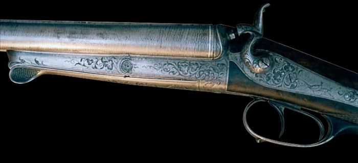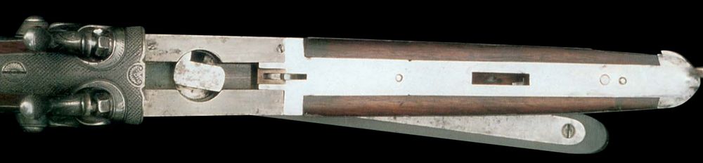 Илл. 1: Система запирания Каземира Лефошэ поворотной личинкой на подствольные крюки. Рычаг нижний, поворотный, заходящий под цевье. Цевье образует с коробкой подвижное неразъемное соединение