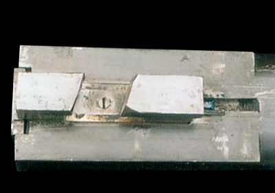 Затворная система ружья Ф.Адольфа проста до неприличия: на стволах его бокфлинта вообще нет традиционных для вертикалок крюков – ни подствольных, ни боковых. Нет и дополнительных разгружающих поверхностей в коробке. Её щёки от самого щитка идут с постепенным занижением, а затем резко переходят в круговые опоры диаметром около 40 мм и толщиной 4-5 мм (рис. 20). На опоры щёк сажается ствольный блок с радиальными выступами такого же диаметра и толщины и запирается верхней планкой, надвигающейся на казённую часть. Затем стволы окончательно фиксируются цевьём: в задней части головкой с выступающими боковыми «усами», а в передней – защёлкой (рис. 21).