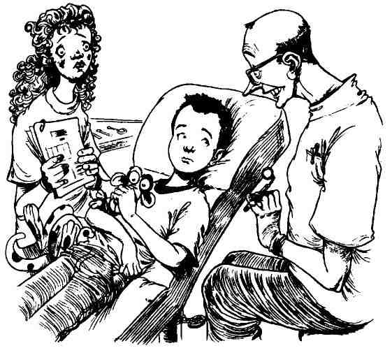 Он вошел в приемную и огляделся. Там сидело еще пятеро пациентов. Мальчишка-подросток со сломанным резцом. Рыжая девчонка с таким же рыжим папой. Тощий старикашка, который издавал странные свистящие звуки. И низенькая толстуха с распухшей щекой — она сидела в уголочке и тихонько постанывала.