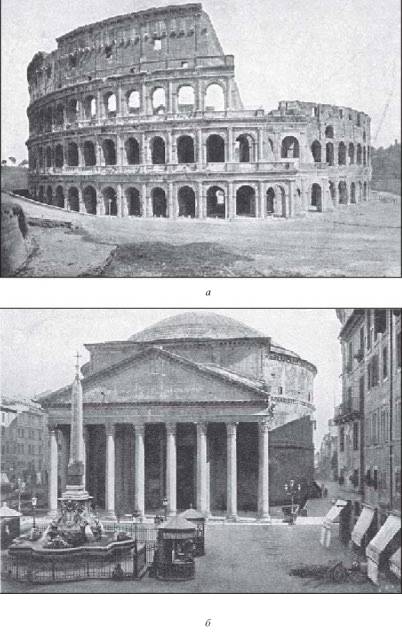 Преемник Траяна Адриан (117-138 гг.) чувствовал себя уже чисто всемирным владыкой. Его сооружения украшали север и юг, запад и восток империи. Рим был обязан ему, между прочим, двойным храмом Венеры и Ромы, развалины которого до сего времени свидетельствуют о его своеобразном великолепии. Он состоял из двух целл, оканчивавшихся двумя полукруглыми абсидами и крытых коробовыми сводами, отделанными внутри роскошными кассетами; целлы эти примыкали друг к другу своими абсидами. Их портики, имевшие по четыре колонны между антами, выходили поэтому на две противоположные стороны в величественную коринфскую колоннаду, заключавшую в себе по десять колонн в узкой стороне и окружавшую целлы, отступая от них на расстояние двух поперечников колонны. Надгробный памятник Адриана, гигантский круглый цилиндрический нижний этаж которого превращен в крепость св. Ангела, составляет доныне центральное место в общем виде Рима. Но развитие типа круглых храмов до недосягаемого совершенства выразилось в произведенной при Адриане перестройке Пантеона, лучше всех других сохранившемся памятнике античного зодчества и первом примере архитектуры храма, рассчитанной главным образом на то, чтобы производить впечатление его внутренним убранством (см. рис. 501, б). На цилиндрической стене, имеющей в плане круг, лежит полусферический купол одинаковой с ней высоты. Величина поперечника основания храма равна высоте купола (более 40 метров). К цилиндрической стене, с входной стороны, пристроен портик, увенчанный фронтоном, с восемью колоннами на лицевой стороне и восемью, расположенными в четыре ряда по его глубине (рис. 502). Связь между прямолинейной задней стеной портика и цилиндрической стеной самого храма составляют незаметные снаружи пустые пространства неправильного очертания. Купол, кажущийся снаружи плоским (стена цилиндрического корпуса храма выше с внешней стороны, чем с внутренней), в нижней своей части поднимается вверх в виде ступеней. Громадная толщина, которая по необходимости дана стене для того, чтобы она выдерживала давление купола, облегчена устройством в ней снаружи замкнутых полукруглых камер с узкими проходами к ним, а внутри – восьми больших ниш, попеременно полукруглых и прямолинейных, украшенных коринфскими колоннами. Свет проникает внутрь через круглое отверстие в куполе. Спокойное освещение распределяется равномерно на все части этого самого благородного, самого пропорционального и изящного по формам сооружения в мире, которое и в настоящее время, несмотря на некоторые переделки и добавки, сделанные в нем по превращении его в христианский храм, все еще производит поразительное впечатление.
