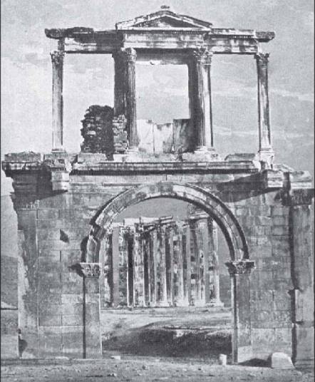 Благодаря Адриану строительная деятельность сильно оживилась также в Афинах.В это время был наконец довершен большой храм Зевса между Акрополем и Илиссом. Олимпейон Адриана, от которого сохранилось 15 коринфских колонн, доныне стоящих на своих местах, был вместе с эфесским храмом Артемиды величайшим из всех греческих храмов. Уже одним количеством колонн окружавшей его галереи, в которой их было два ряда, по двадцать в каждом на длинных, и три ряда, по восемь в каждом ряду на коротких сторонах, он превосходил все прежние афинские храмы. Входом в Новые Афины Адриана (Адрианополь) служила Адриановская арка, по бокам пролета которой стояло по коринфской колонне (рис. 503). Две средние колонны верхнего яруса постройки увенчаны небольшим фронтоном.