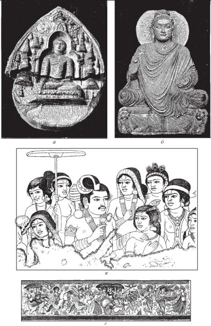В Аджанте мы имеем возможность ознакомиться также и с индийской стенной живописью,от которой кроме малоисследованных остатков в других пещерах важные, но, к сожалению, все более и более разрушающиеся следы сохранились только в 13 подземных залах. Самые значительные или, по крайней мере, самые большие фрагменты этих картин на стенах и потолках, писанных частью а fresco, частью a tempera по тонкому слою штукатурки, находятся в 1, 2, 9, 10, 16-м и 17-м залах. Древнейшие из них, в 9-м и 10-м залах (в), приписывают концу II в. н. э., то есть тому же времени, что и рельефы в Амаравати; позднейшие, к числу которых принадлежат картины в 1-м и 2-м залах, быть может, нисходят до VII в., но большинство их написано в V или VI в. Их копии, находившиеся в Соут-Кенсингтонском индийском музее, отчасти уничтожены пожаром, но выставленные вместо них рисунки дают прекрасное понятие об этой живописи. Джон Гриффитс издал их в двух роскошных томах. Картины эти изображают сцены существования Будды до его воплощения и последних лет его земной жизни, а также из истории его учения и его останков. Свобода, с которой нарисованы отдельные фигуры со всех сторон и во всякого рода движениях, соответствует свободе, господствовавшей в современном этим картинам стиле индийских рельефов. Но ракурсы передаются только приблизительными и бывают верны лишь случайно; о правильной перспективе фона нет и помина ни в отношении линий, ни в отношении красок. Наброски ландшафтов, если в них не обозначены те или другие породы деревьев посредством изображения их листьев в большом размере, несколько кудреваты и спутаны. Дворцы, как и в европейских средневековых рисунках и картинах, изображаются без передних стен, так, чтобы было видно все, что происходит внутри них, за колоннами и стенами фасада. Формы человеческого тела – индийского типа и шаблонного характера; тем не менее беглая моделировка нагого тела внутри резких коричневых контуров выказывает некоторое понимание живописности. Общая композиция иногда отличается строгой симметричностью; но обычно картина бывает переполнена фигурами, нагроможденными несколько беспорядочно.