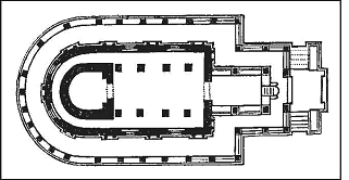 Каким образом от простых буддийских пещерных храмов, замыкавшихся полукружием, произошли свободно стоящие храмы, о том лучше и нагляднее всего дают понятие планы небольших храмов в Аивулли и Питтадкуле в Западной Индии (рис. 566 и 567). Первый из них, который может быть отнесен к VII столетию н. э., несмотря на свою внешнюю колоннаду и на целлу внутри вместо дагобы, еще довольно близко напоминает в отношении плана подземный храм в Карли, а второй, сооруженный, быть может, веком или двумя позже, представляет уже четырехугольный план, квад ратную целлу и колоннаду позднейших больших брахманских хра мов. Здесь над целлой, как бывало потом везде, уже возвышается на четырехугольном основании огромная башня, которая на юге полуострова принимает вообще форму высокой многоуступчатой пирамиды по образцу североиндийской древнебуддийской башни в Будда-Гайе, на севере же имеет слегка криволинейный, клинообразный или конический свод, а снаружи суживается к закругленной верхушке, образуя также легкую кривизну. О форме этих конусообразных башен может дать понятие разрез так называемой черной пагодыв Конараке, в Ориссе (рис. 568). На этом рисунке видна одна из особенностей всех чисто индийских арок, сводов и куполов, а именно сооружение их из горизонтальных рядов камня, выдвигающихся внутрь один над другим. Индийцы почти совершенно пренебрегали кладкой арок и сводов из концентрически расположенных клиновидно отесанных камней даже после того, как магометане принесли с собой в Индию этот способ постройки своих куполов. Но естественным последствием горизонтальности кровель и кладки сводов было преобладание горизонтальных линий в расчленении внешности индийских башен и куполов; быть может, даже расширение капителей колонн консолевидными приставками находится в связи с этим строительным приемом.