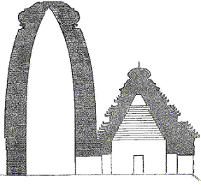 Храмы в местности Орисса на северо-востокеполуострова, простые по плану, приземистые и массивные, сложены из искусно отесанного песчаника без цементной смазки, причем, однако, отдельные их части связаны железными скрепами. Над святилищем и входными галереями высятся конусообразные башни, кверху суживающиеся, но с выпуклым очертанием и плоской надставкой на вершине. Формы пластической орнаментации этих сооружений крайне разнообразны. Трудно представить себе что-либо более характерное для манерной, мягкой, чересчур свободной обработки форм в индийской скульптуре, чем женская статуя, происходящая из храма в Бхубанешваре и находившаяся у Ле-Бона, в Париже (рис. 569). Знаменитейшие из храмов Ориссы находятся, кроме Бхубанешвара (VI, VII и X вв.), в Конараке (X в.) и Джаггернауте (XII в.).