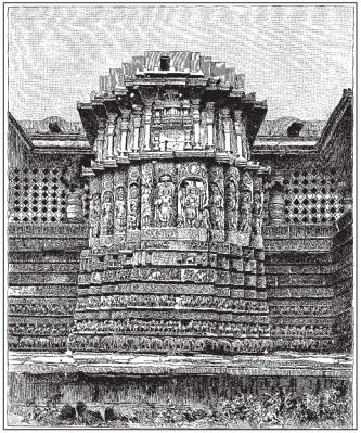 Особый характер приняла индийская архитектура в сердце Декана,в области древних князей Чалукья. В этом чалукинском стиле,как его называл Фергюссон, над центральной целлой храма, имеющей звездообразную форму в плане, возвышается только одна, также звездообразная уступчатая пирамида, обычно увенчанная стилизованным цветком или вазой. Роскошные пластические украшения покрывают собой храм. Среди них особенно резко выделяются полосы фриза, украшенные рядами животных и окружающие горизонтальными рядами весь храм начиная с цоколя. Нижний фриз всегда представляет слонов, второй – львов, третий – коней и т. д.; иногда выше всех этих горизонтальных рядов животных, как, например, в знаменитом храме в Халебиде, идет более широкая полоса, разделенная на части в вертикальном направлении нишами, из которых в каждой помещено по статуе бога. Роскошнейшие из храмов этого рода, к которым надо причислить и Халебидский храм (рис. 570), находятся в провинции Майсура (Мисора) и сооружены между 1000 и 1300 гг. н. э.