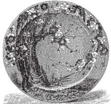 Гончарное искусствов Японии получило новое развитие с того времени, как сёгун Гидейоши привез из своих победоносных походов в Корею (в 1592 и 1597 гг.) несколько искусных гончаров и расселил их по разным провинциям своей империи. Теперь наряду с глазурованными глиняными изделиями, которые продолжают составлять гордость Японии, появляется настоящий фарфор, подражающий китайскому. Японцам благодаря отчасти корейцам, отчасти самостоятельному изучению удалось разгадать секрет производства китайского фарфора, по крайней мере, сотней лет раньше, чем европейцам. Первые опыты приготовления японского фарфора были сделаны в провинции Гицен еще в XVI в., но только около середины XVII столетия японцы научились писать по глазури стекловидными красками. В эту пору возникли в Арите, провинция Гицен, громадные фарфоровые заводы, которые вначале работали только на японцев, но вскоре стали поставлять предметы роскоши также европейцам, находить для своих изделий сбыт на крайнем западе Старого Света. Этим изделиям присвоены названия или провинции Гицен и фабричного пункта Ариты, или гавани Имари, через которую они экспортировались. В Европе ими особенно богаты Лейденский и Дрезденский музеи. С того времени, как Эрнст Циммерманн исследовал и привел в порядок дрезденскую коллекцию, мы знаем, что она вопреки тому, что полагали еще недавно, не только богата роскошными вазами, расписанными голубой и красной красками с позолотой и изготовляемыми в трех или пяти совершенно одинаковых экземплярах для отправки за границу, в самой же Японии почти не считающимися японскими, но богата также превосходными образцами старинного фарфора, изготовленного собственно для японцев. В первой группе, главная вещь которой – чаша шириной 56 сантиметров, преобладают краски голубая, светлая синевато-зеленая и отчасти железная красная. Ко второй группе, в которой цветы, ландшафты и гирлянды, соединенные с покрывающими фон линейными узорами, блещут яркими, блестящими, как лак, красной и темно-голубой красками, относятся только чаши и чаши с крышками. Среди синего фарфора третьей группы, которую до сей поры считали в Дрездене китайской, особенно замечательны две чаши в виде распустившегося цветка. "Кобальтовая голубая краска, – говорил Циммерманн, – хотя никогда и не достигает здесь такой силы и густоты, как в лучших произведениях китайского искусства, однако далеко превосходит китайскую по изяществу своего применения к делу". К японскому фарфору, который раскупали и высоко ценили сами японцы, относятся прежде всего сосуды из Кутани, провинция Кага. Рисунки для восхитительной эмалевой живописи на фарфоре Кутани, исполненные по черным контурам и представляющие великолепное сочетание изумрудно-зеленой, соломенно-желтой и фиолетовой красок, сочинял, по-видимому, не кто иной, как сам Морикагге, лучший ученик Кано Таниу. Чтобы составить себе понятие об этих рисунках, достаточно взглянуть на весенний ландшафт, изображенный на блюде из коллекции Гонзе в Париже (рис. 627).
