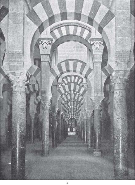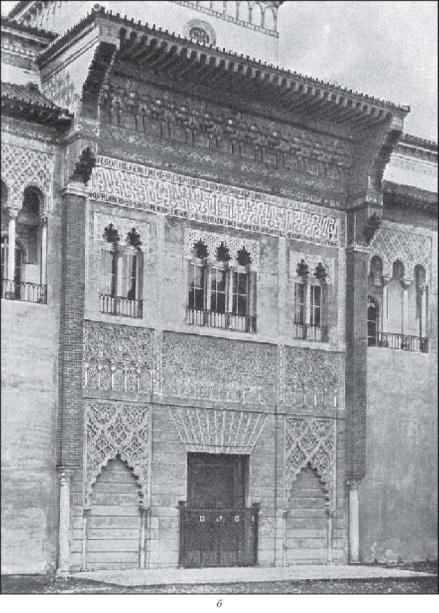 В X и XI столетиях, когда арабско-мавританская цивилизация на испанской почве во многих отношениях превосходила образованность остальной Европы, Кордова, Гранада, Сеговия, Таррагона и Толедо наполнились новыми мечетями. Небольшая мечеть в Толедо, теперь пустынь "Cristo de la luz", принадлежит XI столетию. В ее плане центральный четырехугольник разделяется четырьмя взятыми из вестготской церкви колоннами на девять равных квадратов, из которых над каждым лежит по куполу, причем купол над средним квадратом выше остальных. Все здание, которое Юсти называл "замысловатым, смелым кабинетным произведением арабской конструкции", отличается грациозностью своих подковообразных арок, перекинутых через подпоры, своих аркад в виде трилистника в верхних частях стен, линий куполов. В XII столетии возникли роскошные дворцы и мечети как в Феце и Марокко, так и в Севилье и других испанских городах. От первоначального здания Алькасара, мавританского королевского дворца в Севилье, сохранились лишь немногие остатки: он уступил свое место постройке XIV столетия, то есть уже христианского времени, которое, однако, воспользовалось услугами, очевидно, мавританских архитекторов. Главный фасад этого здания с его сталактитовыми арками над дверями и окнами выстроен по образцу фасадов XII в. ( б). От большой севильской мечети, обращенной в католический собор, остался только один минарет, сделавшийся колокольней, которая пользуется обширной известностью под названием Гиральдаи составляет теперь главную достопримечательность Севильи. Гиральда, как и другие подобные ей башни африканских мечетей, в противоположность стройным минаретам Востока представляет собой массивную четырехгранную башню, на которую взбираются по очень удобной лестнице. Верхние плоскости ее стен покрыты тонкой сеткой арабесок, идущих диагоналями в четырехугольных рамах и своим продолжением образующих вверху почти стрельчатые, усаженные зубцами ложные арки и оконные ниши, которые как бы стоят на карнизах, разделяющих башню на ярусы. Гиральда и главный фасад Алькасара в его первоначальном виде считаются лучшими образцами второго, или среднего, периода развития мавританского стиля.
