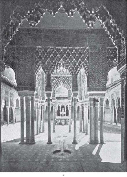 С каждой из четырех сторон Дворика львов мы вступаем в один из главных залов этой части Альгамбры; с северо-западной короткой стороны находится вход в зал de los Mocarabes, род передней, стены которой первоначально были покрыты синими, красными и золотыми орнаментами и увенчивались прелестным куполом; северо-восточная длинная сторона примыкает к лежащему несколькими ступенями выше двора залу с полом, состоящим из двух больших мраморных плит; цоколь этого роскошного зала, известного под названием "зал Двух сестер", обложен чудным фаянсовым кафелем, а потолок представляет собой сталактитовый свод, замечательный по своей величине и вкусу отделки; двери кедрового дерева в этом зале, некогда золоченые, покрыты роскошной резьбой, а штукатуренные стены – восхитительными, причудливо переплетающимися арабесками. "Если всмотреться в эти удивительные узоры, – говорил Шак, – в которых самая необузданная фантазия соединяется с обдуманным расчетом, то каждую минуту кажется, что вот уже истощены все комбинации, какие только возможно придумать, а между тем с удивлением видишь, как из прежних комбинаций вырастают все новые и новые". На другой длинной, юго-западной стороне Дворика львов находится зал Абенсеррахов, разделенный на три части двумя великолепными, широкими зубчатыми арками. Трехъярусная средняя часть зала имеет высокий сталактитовый потолок, представляющий собой переходы от четырехугольника к восьмиугольнику, от восьмиугольника к шестнадцатиугольнику и, наконец, от шестнадцатиугольника к кругу. С юго-восточной короткой стороны двора находится вход в зал Суда ( г); своими сталактитовыми сводами и зубчатыми арками она производит впечатление капельниковой пещеры, по манию волшебных сил кристаллизовавшейся ритмично и симметрично.