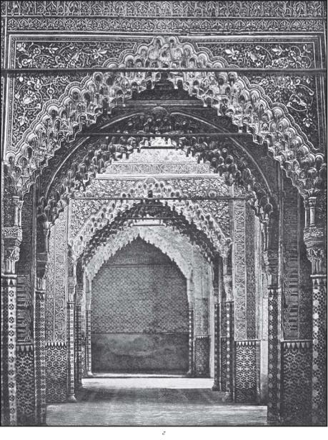 В Испаниипосле изгнания из нее мавров христианские государи продолжали пользоваться услугами мавританских мастеров при сооружении зданий в арабском вкусе; стиль этих христианско-мавританских построек принято называть мудехарским.Как на образцы этого стиля XIII и XIV столетий можно указать на две синагоги в Толедо, обращенные в христианские церкви Санта-Мариа ла Бланка и Эль Трансито. Санта-Мария ла Бланка,старейшее из этих двух зданий, – пятинефное сооружение с плоским покрытием и 28 подковообразными арками, опирающимися на восьмигранные столбы, увенчанные замечательными капителями в виде сосновых веток и шишек (рис. 655). Эль Трансито– однонефное здание, отличающееся роскошью своих арабесок и великолепием своих ничем не замаскированных подкровельных стропил кедрового дерева, украшенных инкрустацией из слоновой кости. Так называемый Дом Пилата в Севилье – здание уже XVI столетия. Цоколи стен в этом дворце облицованы блестящим кафелем всяких цветов и узоров, а в его орнаментации к мавританским формам присоединяются формы готики и даже эпохи Возрождения, что образует новое, роскошное, вычурное, но не лишенное гармоничности целое.