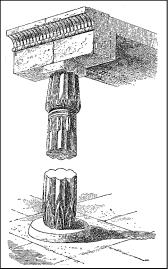 Цветущие растения, которые, как уже было сказано выше, образуют или в одиночку, или в виде пучков колонны, возвышающиеся на базах, имеющих форму небольших земляных куч, – это Nymphaea lotus и Numphaea caerulea, папирус, пальма, некоторые породы колокольчиков и тростник. История развития этих архитектурных форм чрезвычайно ясно изложена Борхардтом. Чаще всего встречаются колонны лотосовидные и папирусовидные. У первых, имеющих капители в форме нераскрывшегося или распустившегося цветка, нередко недостает основания, чего почти никогда не наблюдается у папирусовидных колонн, капители которых представляют закрытую или раскрытую совокупность колосьев. Отдельные стебли пучка у лотосовидных колонн имеют в поперечном разрезе круглую, а у колонн папирусовидных – треугольную форму. Стержни колонн первого рода не имеют ни листьев у основания, ни утолщения, тогда как стержни папирусовидных колонн суживаются внизу и как бы обернуты листьями. В лотосовидных колоннах лепестки чашечки цветка, играющей роль капители, доходят до самого ее верха, а в папирусовидных колоннах они значительно короче и окаймляют только нижнюю часть капители. На рис. 101 – колонна в виде папируса, а на рис. 102 – в виде лотоса, причем чашечки и в той, и в другой закрыты.