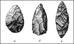 Острия копий или стрел дилувиальной эпохи в Солютре уже известны своей формой, напоминающей лавровый или ивовый лист, причем поверхность их покрыта правильными полосками. Французская наука создала целую историю развития дилувиальной кремневой утвари, благодаря чрезвычайно богатым находкам во Франции; четыре ступени этой истории наука обыкновенно называет по типам, преобладающим в Шелле (Сена и Марна), Ле-Мустье (Дордонь), Солютре (Сона и Луара) и Ла-Маделене (Дордонь); в последнее время Сальмон, исключив третью ступень, установил три палеолитические и три неолитические ступени и таким образом всю каменную эпоху разделил на шесть отделов. Во всех этих делениях, конечно, есть много произвольного. Но достаточно взглянуть на изображенные на рис. 2 и сохраняемые в музее в Сен-Жермен-ан-Ле (Saint-Germain-en-Laye) кремневые острия, чтобы увидеть, что от типа а из Шелля до типа б из Ле-Мустье, а от последнего до типа в из Солютре, в этих предметах заметно усовершенствование формы, указывающее на внутреннее развитие, на первое развитие в области человеческой ловкости и сноровки, заслуживающее нашего внимания.