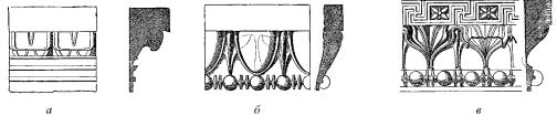 Раскрашивание этих терракот в храмах шло с начала VI в., до некоторой степени параллельно с орнаментированием глиняных сосудов. Терракотовые украшения вышеупомянутого древнейшего храма в Селинунте, как и коринфские вазы, расписаны прочными красной и черной лаковыми красками по бледному фону глины (рис. 254). Наряду с линейными орнаментами и простыми двойными плетенками здесь уже появляются орнаменты на мотивы растительного царства. Венок из свешивающихся листьев на верхней полосе карниза еще по-дорически полуугловато геометризован. Но пальметты в местах соприкосновения двойных плетенок уже имеют такую же форму, как и на милосских глиняных вазах; соединенные ряды, состоящие попеременно из пальметты и распустившихся цветков лотоса, которыми увенчана верхняя полоса карниза, имеют восточные формы, облагороженные эллинским чувством стильности. Меандры, плетенки, розетки и пальметты – главные составные части терракотовых карнизов сокровищницы Гелы в Олимпии (рис. 255). В одном из позднейших храмов Селинунта на терракотовом карнизе, между меандровой лентой и рядами лотосов и пальметт, находится шнур перлов (астрагал) почти в ионическом вкусе (рис. 256).