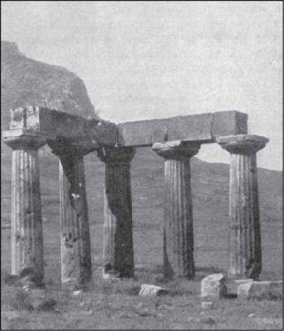 К древнейшим дорическим храмам прежде причисляли (например, Дурм) храм в Ассосе, на эолийском берегу Малой Азии. На его колоннах – от 16 до 18 каннелюр. На брусочках под триглифами и на мутулах нет капель. На архитраве, вопреки обычаю, находятся скульптурные украшения. Судя по стилю этих украшений, к которым мы еще вернемся, они должны быть более позднего происхождения. Самым древним из сохранившихся дорических храмов прежде считали храм в Коринфе. Без сомнения, он принадлежит глубокой древности, как о том можно заключить по тому, что в его окружной галерее 6415 колонн, равно как и по их тяжеловесным стержням на 20 каннелюрах и по сильно выдающимся вперед капителям, еще лишенным желобчатой шеи (рис. 253).
