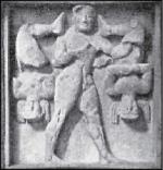 По времени происхождения рядом с древнейшими аттическими фронтонными группами следует из числа украшений на метопах дорических храмов прежде всего поставить три метопные группы среднего храма (С)в селинунтском Акрополе. Эти скульптуры, относящиеся к началу VI в., находятся в Палермском музее. Они представляют собой квадратные метровые плиты известкового туфа. Сюжеты изображений взяты из греческих героических сказаний. На одном из метопов представлен Геракл, несущий двух керкопов, висящих на жерди головой вниз (рис. 275); на другом мы видим Персея, который под покровительством Афины Паллады отсекает голову Медузы, опустившейся на одно колено и рождающей перед своей смертью коня Пегаса (рис. 276); на третьем метопе передний план занимает колесница, запряженная четырьмя лошадьми. Круглые пучеглазые головы коренастых фигур, изображенных на этих рельефах, обращены en face; их ноги и ступни круто повернуты в сторону, быть может, для того, чтобы они не выступали вперед, а может быть, и просто по неумелости художника. Неумелость сказывается не только в этом повороте, она видна и в чрезмерной массивности бедер в сравнении с туловищем, и в том, как фигуры Афины Паллады и Медузы втиснуты в отведенное для них пространство. Тем удачнее приспособлено изображение Геракла и керкопов к линиям квадрата, тем больше наблюдательности заметно в подробностях этого рельефа, например в свесившихся волосах керкопов, тем смелее ракурс в изображении коней на третьем метопе, задние ноги которых твердо стоят позади передних. Здесь все еще выказывается своего рода первобытная сила, чувствуется стремление художника возможно лучше заполнить, не нарушая требований рельефности, данное пространство, квадратная форма которого соответствует квадратичной стилизации форм тела фигур. Хотя рельеф здесь настолько высок, что фигуры лишь чуть-чуть прилеплены к заднему фону, тем не менее художник твердо держится правила, по которому ни одна часть изображения не должна выходить из первоначальной передней поверхности плиты. Едва ли менее древнего происхождения скульптуры сокровищницы сикионцев в Дельфах, из числа которых известностью пользуются метопы с изображением шествия Идаса и Диоскуров с их добычей. Фигурам, идущим рядом с быками, придан величавый, монументальный характер. Окраска по желтоватому фону камня подбором красок походит на живопись древнекоринфских ваз. Не менее древними надо считать рельефы селинунтских метопов, из которых один изображает Европу на спине Зевса, принявшего вид быка, другой – сидящего сфинкса, третий – Геракла, усмиряющего быка. Они исполнены в стиле греческого полного рельефа, противоположного стилю плоского рельефа, постоянно изображавшего фигуры в профильном положении даже тогда, когда живопись, как требовали ее свойства, уже освободилась от этого.