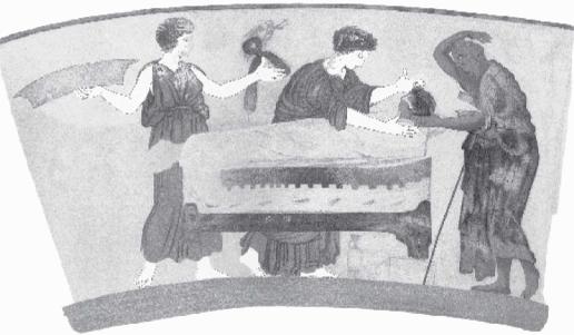 Так как нововведения Аполлодора отмечают собой границу, за которую высокохудожественная роскошь ваз уже не могла переступить, оставаясь верной законам своего стиля, то начиная с этого времени рисунки на вазах дают еще меньшее понятие об общем впечатлении образцовых произведений станковой живописи. Однако надо заметить, что некоторые из аттических лекифов этой эпохи, расписанных красками по белому фону, тем не менее представляют попытки моделировать обнаженные части фигур посредством их оттенения. Примером подобной попытки может служить описанный Винклером лекиф из Берлинского музея, на котором изображено оплакивание покойника, лежащего на носилках (рис. 334). Но такую моделировку в этом рисунке имеют только коричневые мужские фигуры; головы же, руки и ноги женщин еще светлее, чем светлый глиняный фон, написаны без теней, совершенно плоско. Изображения этого рода имеют важное значение для характеристики переходной ступени развития греческой живописи.