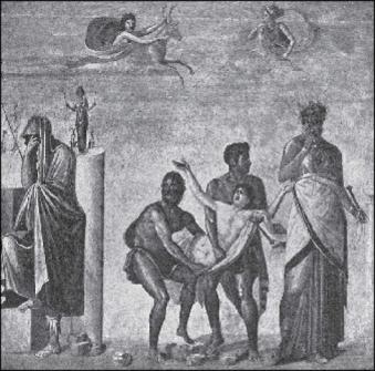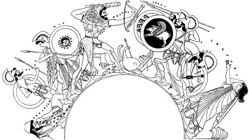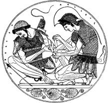 Выдающимся талантом еще строгого направления был Пейфин,которому Фуртвенглер и Гартвиг приписывали берлинскую чашу с подписью художника Созия (рис. 338). Снаружи на этой чаше изображено собрание богов, а внутри представлен Ахилл, перевязывающий рану своему другу Патроклу. При полной строгости рисунка глаза у фигур поставлены правильно.