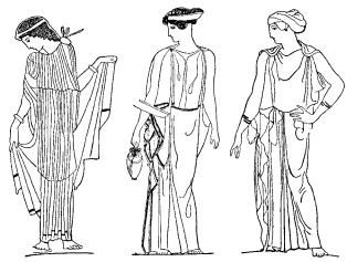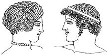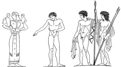 Старейшие из картин этого рода, в которых фигуры расположены в ряд на одном и том же уровне, представляют нам очень часто образы, отражающие в себе манеру Полигнота, тогда как, напротив, на изображения с фигурами в несколько рядов, отличающиеся более мягкими и свободными формами, обычно указывают как на дающие понятие о расположении фигур в полигнотовских стенных картинах. Это указание едва ли основательно, так как встречающаяся иногда на вазах рассматриваемого рода "разбросанность фигур" нелегко вяжется с характером монументальной живописи. Постепенное развитие изображения положения ног и стоп у фигур в греческой вазовой живописи, по Винтеру, см. на рис. 339. Рис. 340, вероятно более поздний, чем предыдущий рисунок, дает представление о развитии изображения одежды. Последняя из этих трех фигур – Мелита на вазе Кодроса.