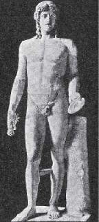 Пифагор,уроженец, вероятно, Самоса, учился, по-видимому, у Клеарха в Регии и работал преимущественно для Дельф и Олимпии. Основные его произведения – бронзовые статуи победителей в состязаниях. Однако к числу знаменитейших его работ, находившихся в Сицилии и Южной Италии, принадлежат два мифологических изваяния, а именно "Раненый Филоктет", в Сиракузах, и "Европа на быке", в Таренте. Художественным направлением этого мастера занимались еще древние писатели. "Он первый, – писал Плиний Старший, – стал изображать мускулы и жилы и обрабатывать волосы с большой тщательностью". В отношении воспроизведения мускулов и вен, которые мы находим еще в фигуре умирающего воина на восточном фронтоне Эгинского храма (см. рис. 293, в ),Пифагор, можно сказать, достиг совершенства в оживлении поверхности членов человеческого тела. Но такой же успех приписывается ему и в соблюдении пропорций и в ритмичности движений. Полагают, что "Филоктет" Пифагора дошел до нас в копиях на некоторых резных камнях. В них, выражаясь словами Брунна, "мы находим прежде всего скрещивание членов таким образом, что движение правой руки соответствует движению левой ноги, и наоборот". К произведениям Пифагора, по Фуртвенглеру, относятся "Кулачный боец", Лувр, и "Голова юноши" из Перинфа, дрезденский Альбертинум. Стиль этого художника Фуртвенглер усматривал также в знаменитом бронзовом "Мальчике" – победителе в беге. Но эта спокойная, тонко прочувствованная фигура если и представляет сходство со стилем Пифагора, то лишь отдаленное.