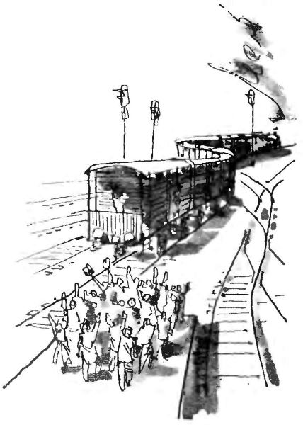 На вокзале было обычно — сумрачно, гулко и просторно. Народу было мало. Но впереди, в стороне от бетонных высоких платформ у длинного состава теплушек шевелилась громадная толпа с какими-то плакатами, транспарантами, знамёнами.