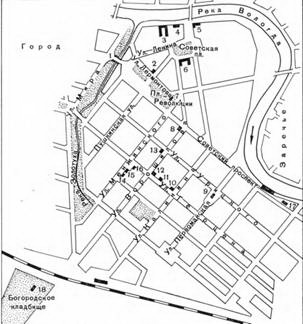 1 — Каменный мост; 2 — дом Дворянского собрания; 3 — здание облисполкома; 4 — дом губернатора; 5 — дом генерал-губернатора; 6 — Странноприимный дом (мужская гимназия); 7-церковь Иоанна Предтечи в Рощенье; 8 — дом Соковикова; 9 — церковь Покрова в Козлене; 10 — деревянный особняк; 11-дом Левашова; 12–16 — деревянные особняки; 17 — Петровский домик; 18 — церковь Богородского кладбища