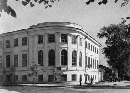 Угол центрального из трех лучей — улицы Пушкина — со стороны площади Революции отмечает великолепный трехэтажный особняк бывшего Дворянского собрания (№ 14/21) — ныне Филармония. Дата его сооружения точно неизвестна: в 1780 году он уже существовал, а в 1822 году перешел в собственность городского дворянства. Угловая, закругленная часть здания с плоскими ионическими пилястрами и небольшим аттиком, а также хорошего рисунка и пропорций оконные проемы с легкими филенчатыми обрамлениями не оставляют сомнения в своей принадлежности русскому классицизму XVIII века (илл. 28).