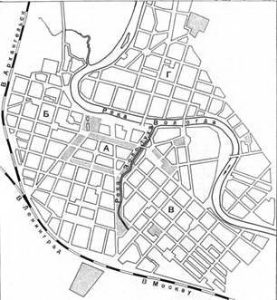 2. Схематический план Вологды А — Город; Б — Верхний посад; В — Нижний посад; Г — Заречье