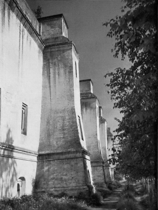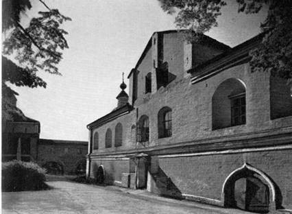 Высокие каменные стены с башнями по углам, заменившие прежнюю, деревянную ограду Архиерейского двора, были возведены в 1671–1675 годах (илл. 10). Осуществлял это строительство архиепископ Симон, который не без хвастовства и цинизма сообщал в своей челобитной в столицу, что «ограда каменная состроилась по воле всесильного бога, в гладное время небольшой казной, и многие православные христиане работали из хлеба, безденежно». В основу строительства были положены чисто идеологические задачи: возвеличение и прославление церкви и самого архиерея. Сооружение монастырей или резиденций духовных властей, превратившихся теперь в «крепости духа», было характерным для конца XVII века. Наиболее яркий пример тому — ростовская митрополия (кремль), созданная видным церковным деятелем, митрополитом Ионой Сысоевичем.
