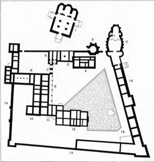 1 — Софийский собор; 2 — Воскресенский собор; 3 — колокольня; 4 — палаты Казенного приказа; 5 — двухэтажный корпус; 6 — надвратная Воздвиженская церковь; 7 — переходы; 8 — консисторский корпус; 9 — Архиерейские палаты с церковью Рождества Христова; 10-Иринеевский корпус; 11 — Гаврииловский корпус; 12 — палаты Иосифа Золотого; 13-служебные корпуса; 14 — стены и башни Архиерейского дома