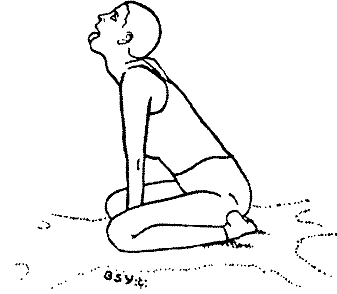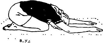 Медленно вдыхая, наклоняйтесь вперёд. Руки, туловище и голова должны оставаться на одной линии. В конце выдоха лоб и руки должны лежать на полу перед коленями (см. рисунок). Тем, для кого это оказывается невозможным, следует наклоняться настолько, насколько это удобно. Расслабьте все тело, стараясь, чтобы руки были полностью расслабленными. Дышите медленно и глубоко.