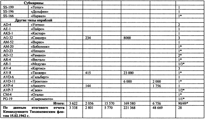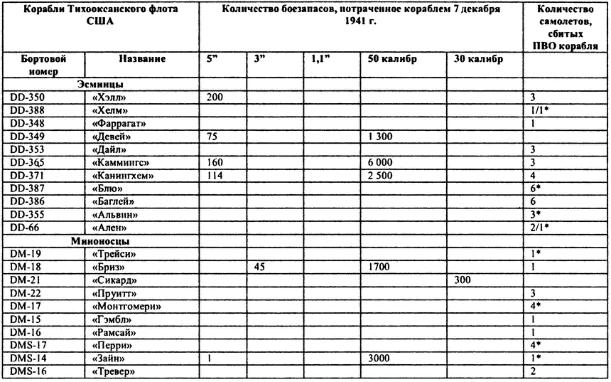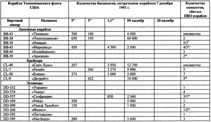 Интересная таблица, не правда ли? Учитывая то, что ошибались не только капитаны конкретных кораблей, по три раза считавшие один и тот же сбитый самолет. Ошибались и наземные ПВО 14-го военно-морского округа. Вообще титаническая работа предстояла Киммелю, чтобы установить реальные потери японской стороны, кстати, он ошибся всего на 8 машин. Американцы усилиями ПВО армии и флота сбили 20 самолетов. Разночтения в расходе боеприпасов скорее всего объясняются тем, что адмирал в финале учел не только стрельбу кораблей, но и наземных ПВО ВМС, а также приплюсовал все то, что ушло на дно вместе с погибшими линкорами.